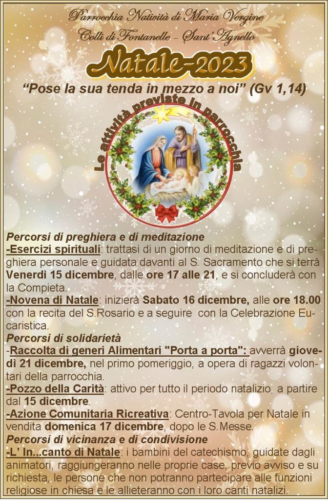 Orario delle funzioni religiose e degli eventi prenatalizi previsti in Parrocchia Pubblicato giorno 11 dicembre 2023 - Archivio, Insieme si può Carissimi, vi pubblico la locandina con tutti gli eventi previsti fino a Natale in modo che ne siate informati in tempo. Buona serata a voi tutti!!!